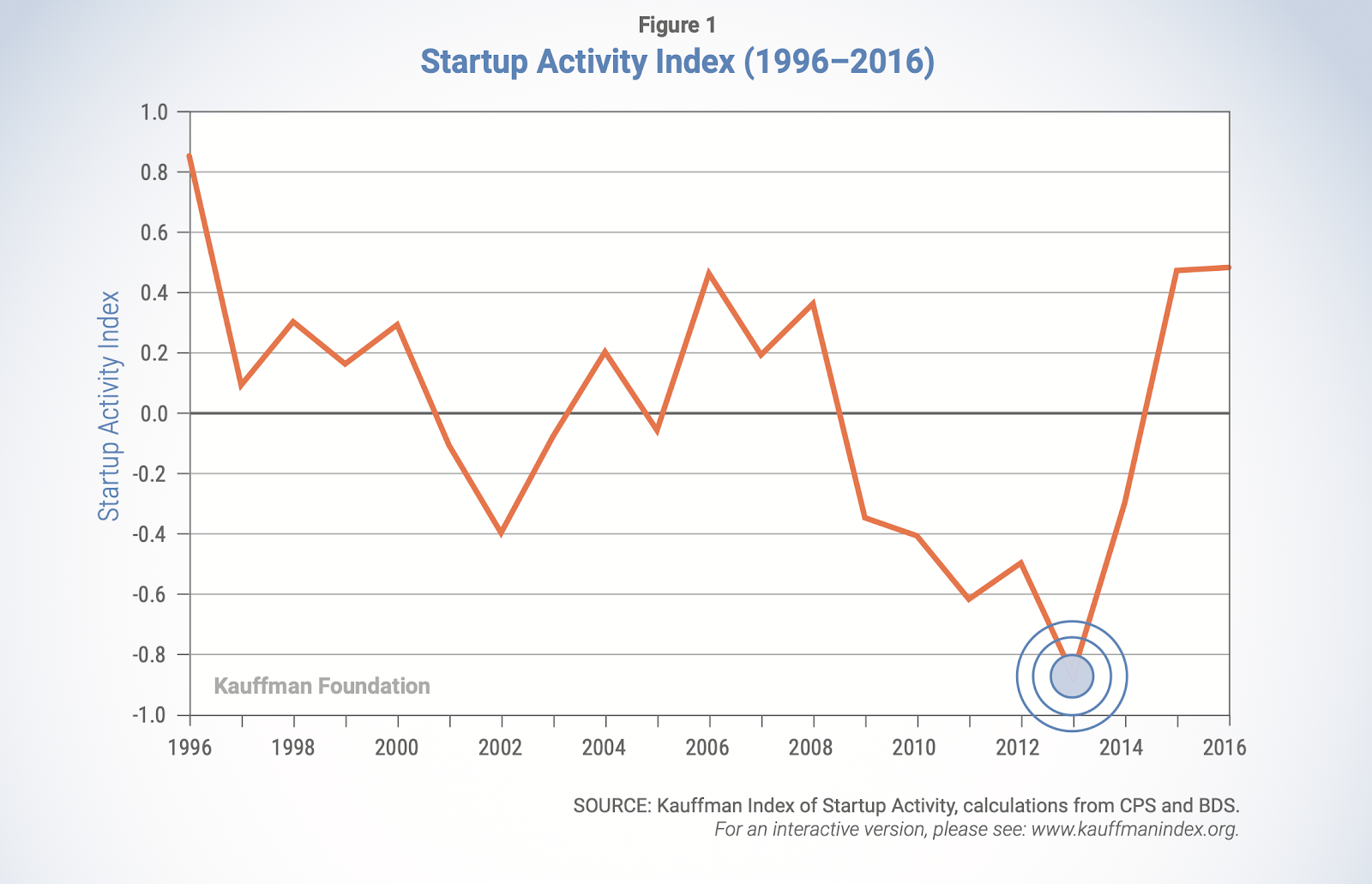 Yet, startup activity under the Obama Administration was actually declining for most of his time in office, according to the Kauffman Index of Startup Activity. It rebounded sharply in 2013, mostly driven mostly by “more people entering entrepreneurship and more people entering out of choice rather than necessity,” according to a 2016 Kauffman report. But even with overall startup activity rebounding in following 2013, new businesses with employees were still on a long-term decline, the report said.